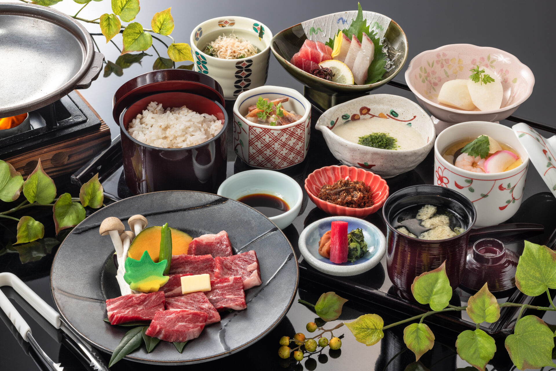 ご宿泊のお客様だけに用意しました、前菜・お造り・茶碗蒸し・焼物・揚物・酢の物、熊本県産「味彩牛」を使った美味出汁鍋。